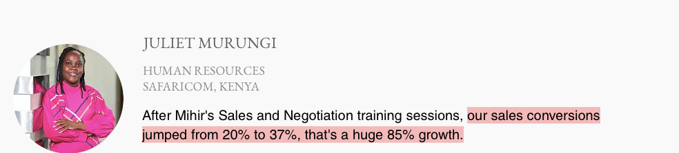 Sales professionals from Kenya's largest telecom company increased their Closing Ratio from 20% to 37% after attending Sales and Negotiation sessions.